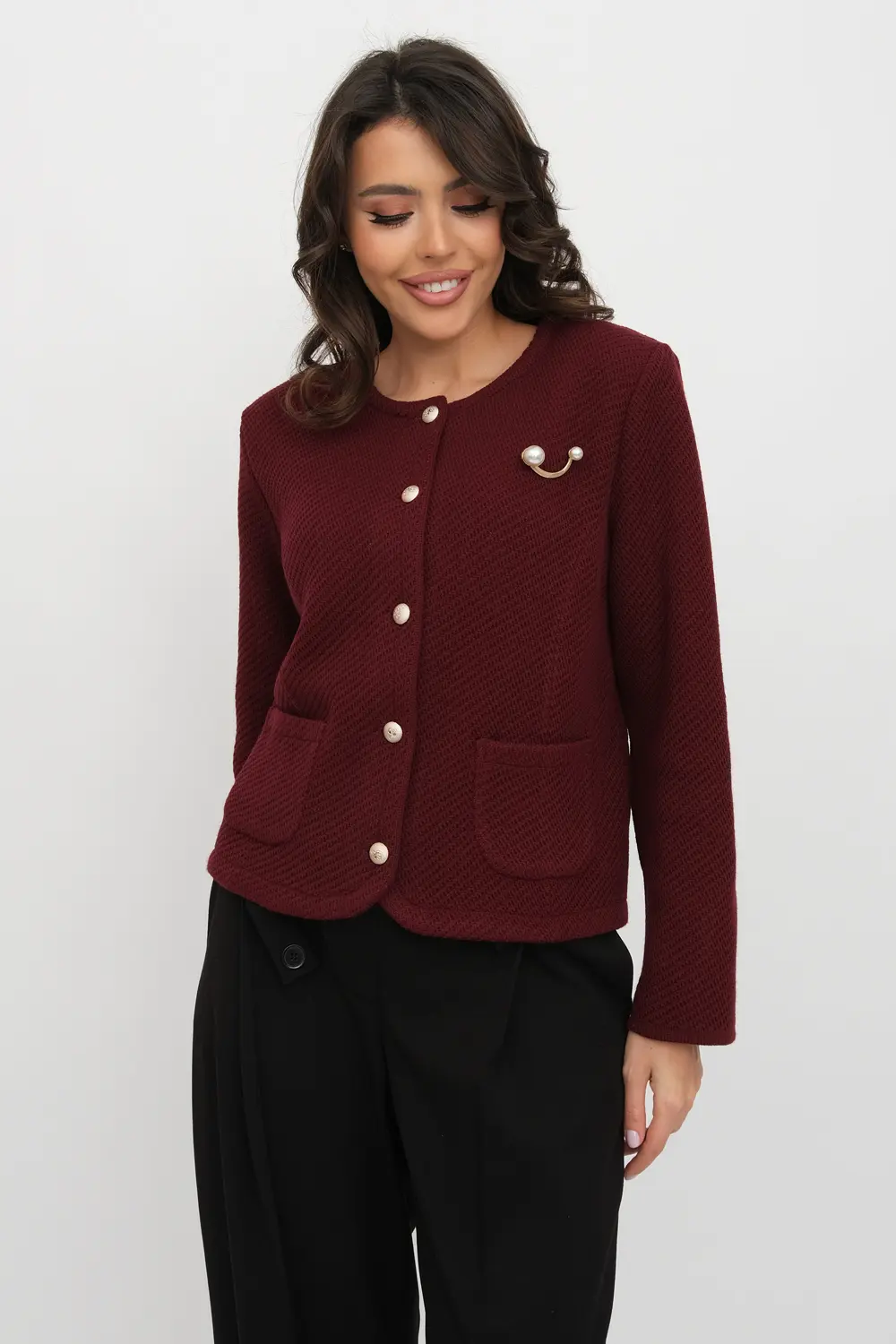 - Классический женский вязаный жакет полуприлегающего силуэта на пуговицах с круглой горловиной. Рукава длинные. Жакет выполнен из качественной пряжи с составом 30% хлопок 70% ПАН. Модель имеет функциональные накладные карманы. Жакет выполнен структурным переплетением, за счет чего имеет комфортную посадку по фигуре и эффектный внешний вид.