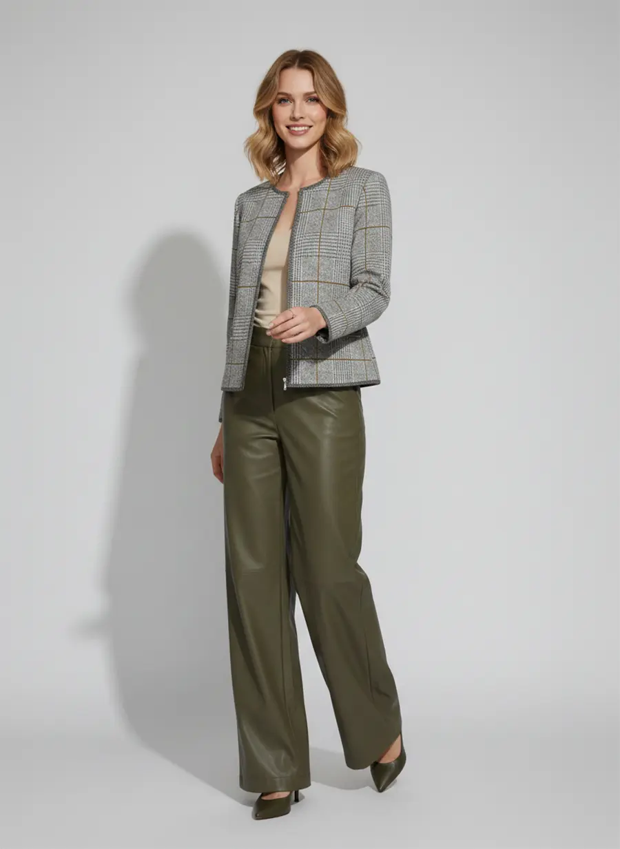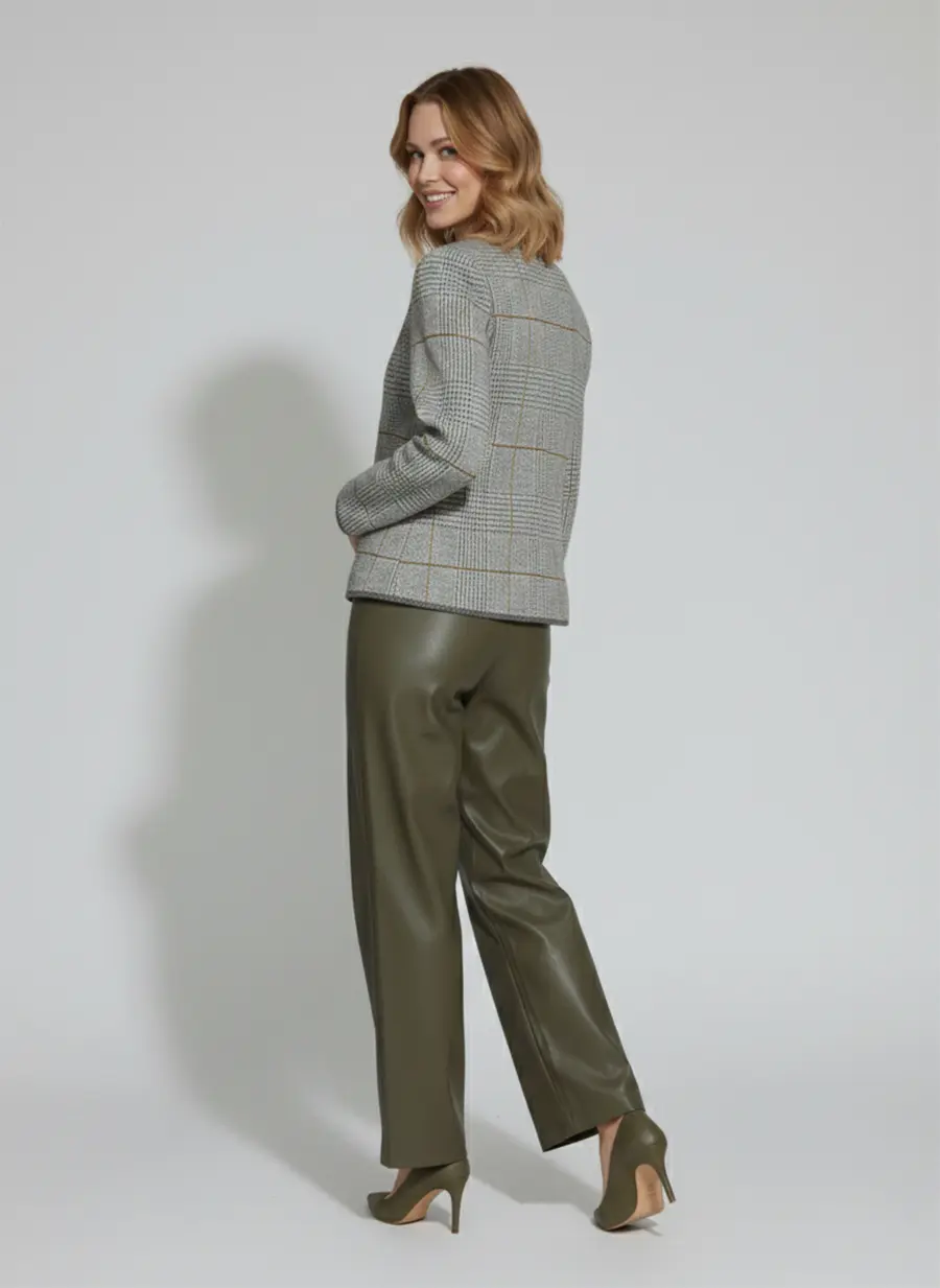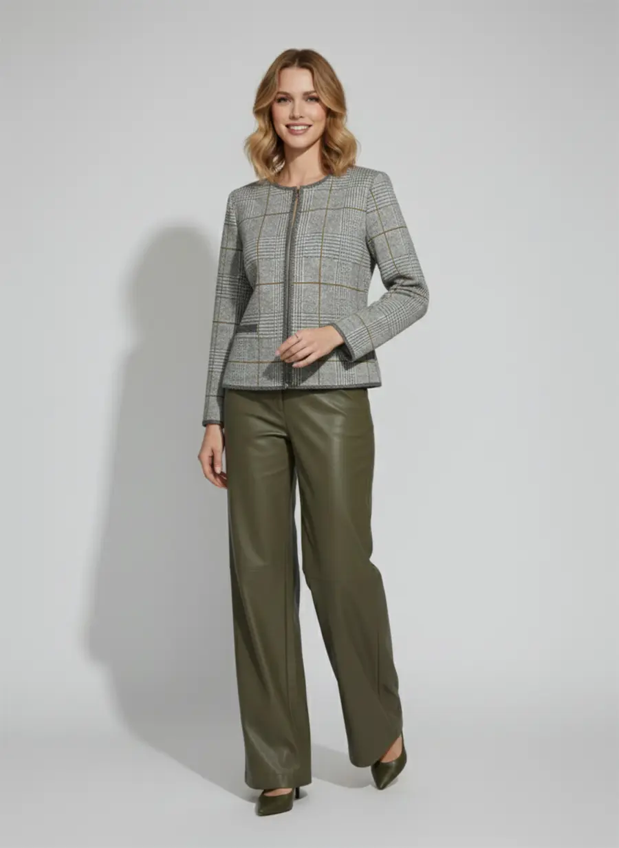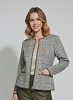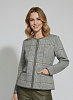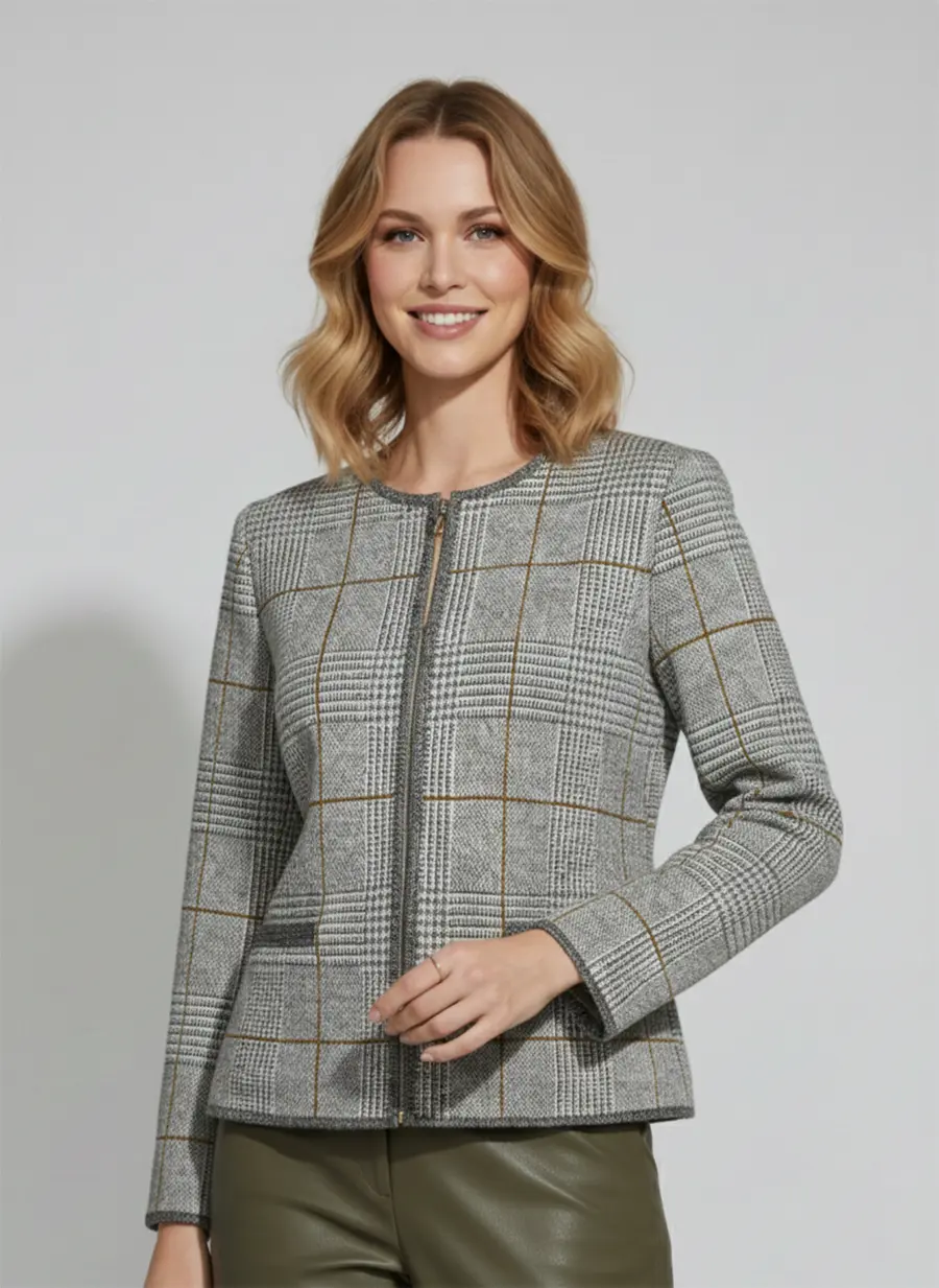 - Жакет женский полуприлегающего силуэта с круглой горловиной. Жакет вязаный на молнии. Выполнен жаккардовым, структурным переплетением рисунок клетка. Контрастная отделка