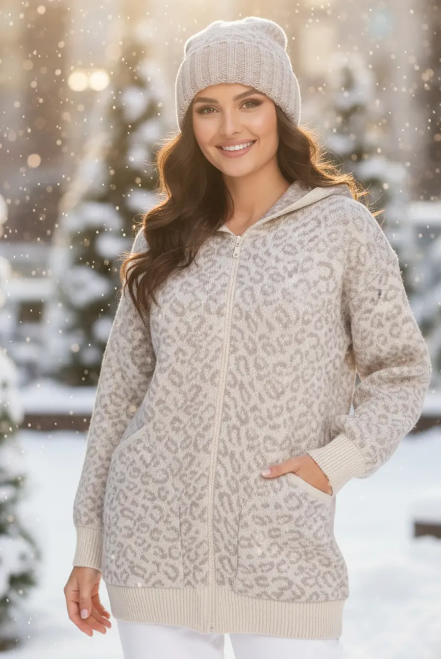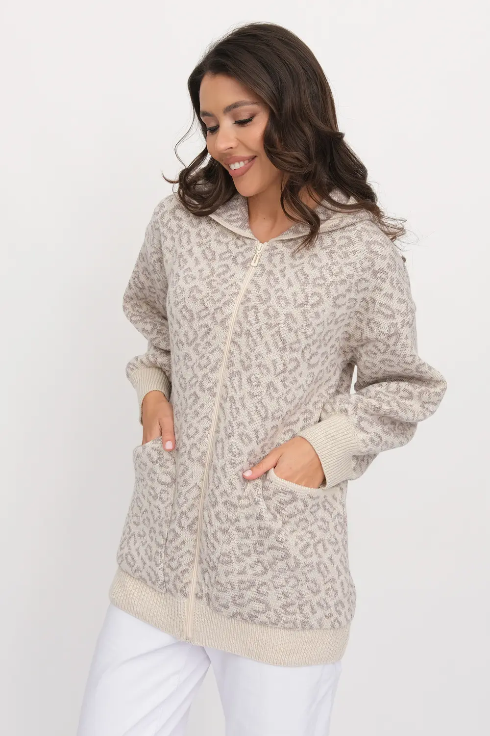 - Жакет свободного силуэта на молнии с капюшоном. Два накладных кармана по бокам изделия. Рукава втачные длинные, плечо спущенное. Низ изделия и низ рукавов вывязан эластичным переплетением. Жакет выполнен жаккардовым переплетением, образующим анималистический рисунок.
