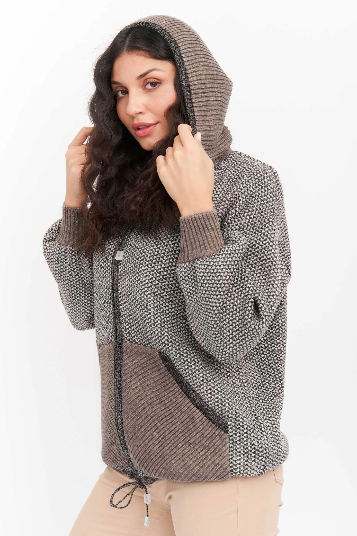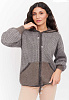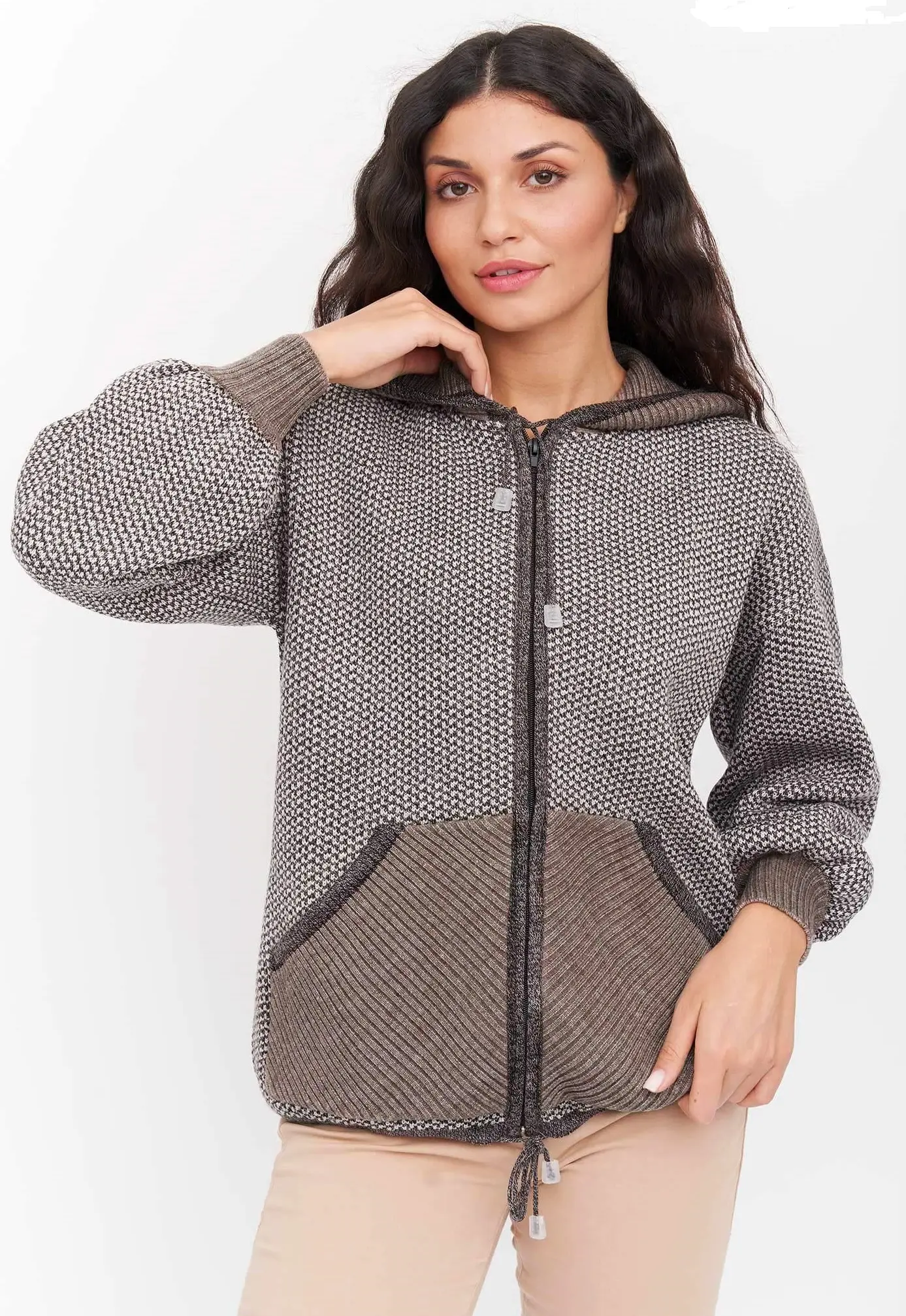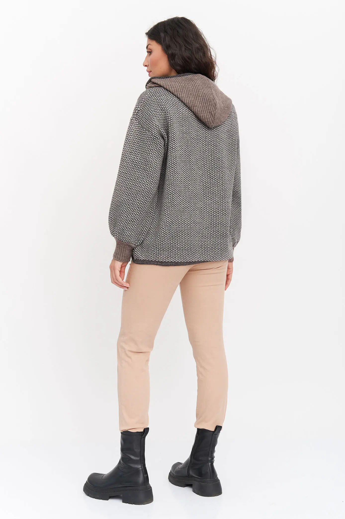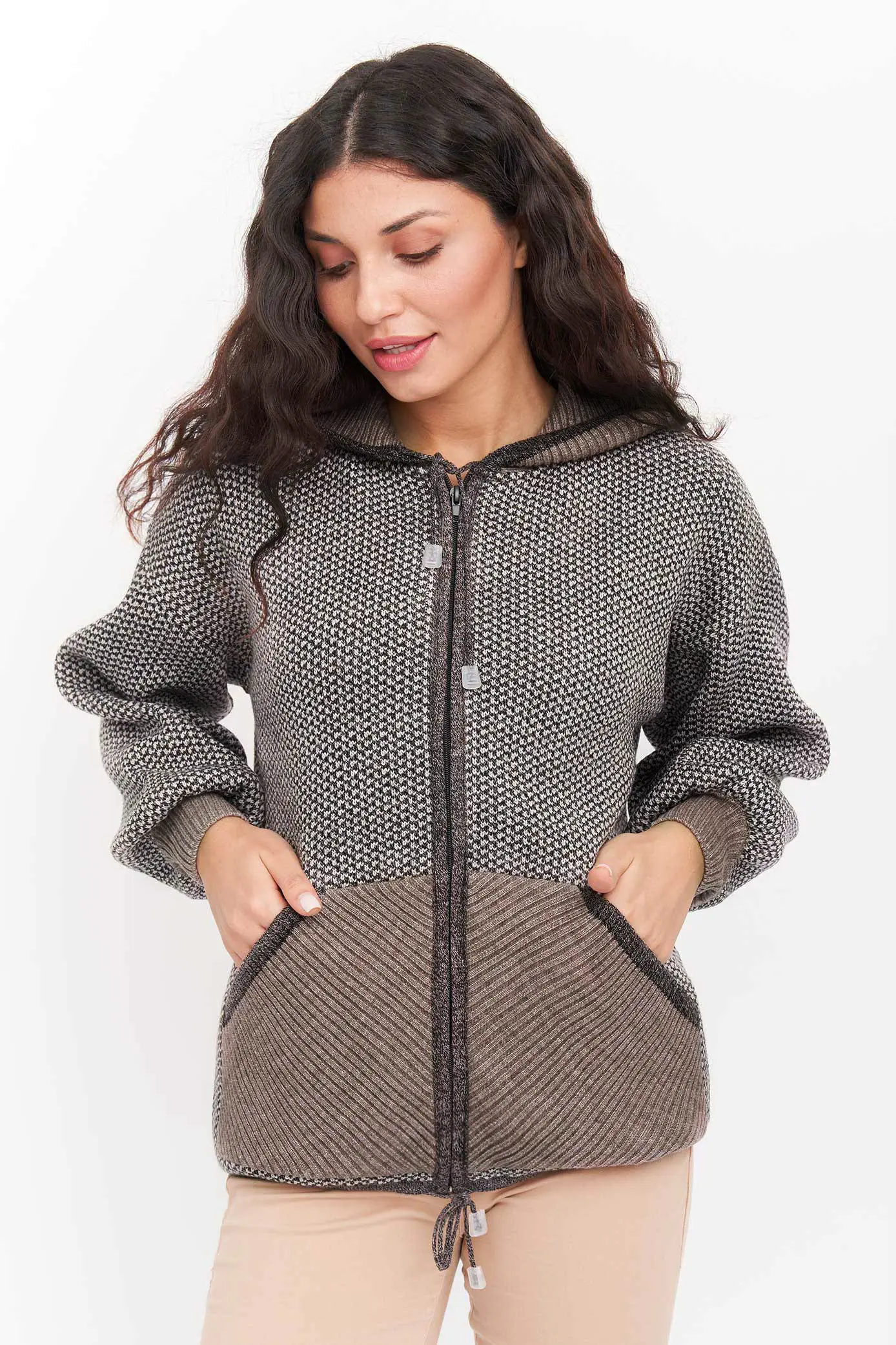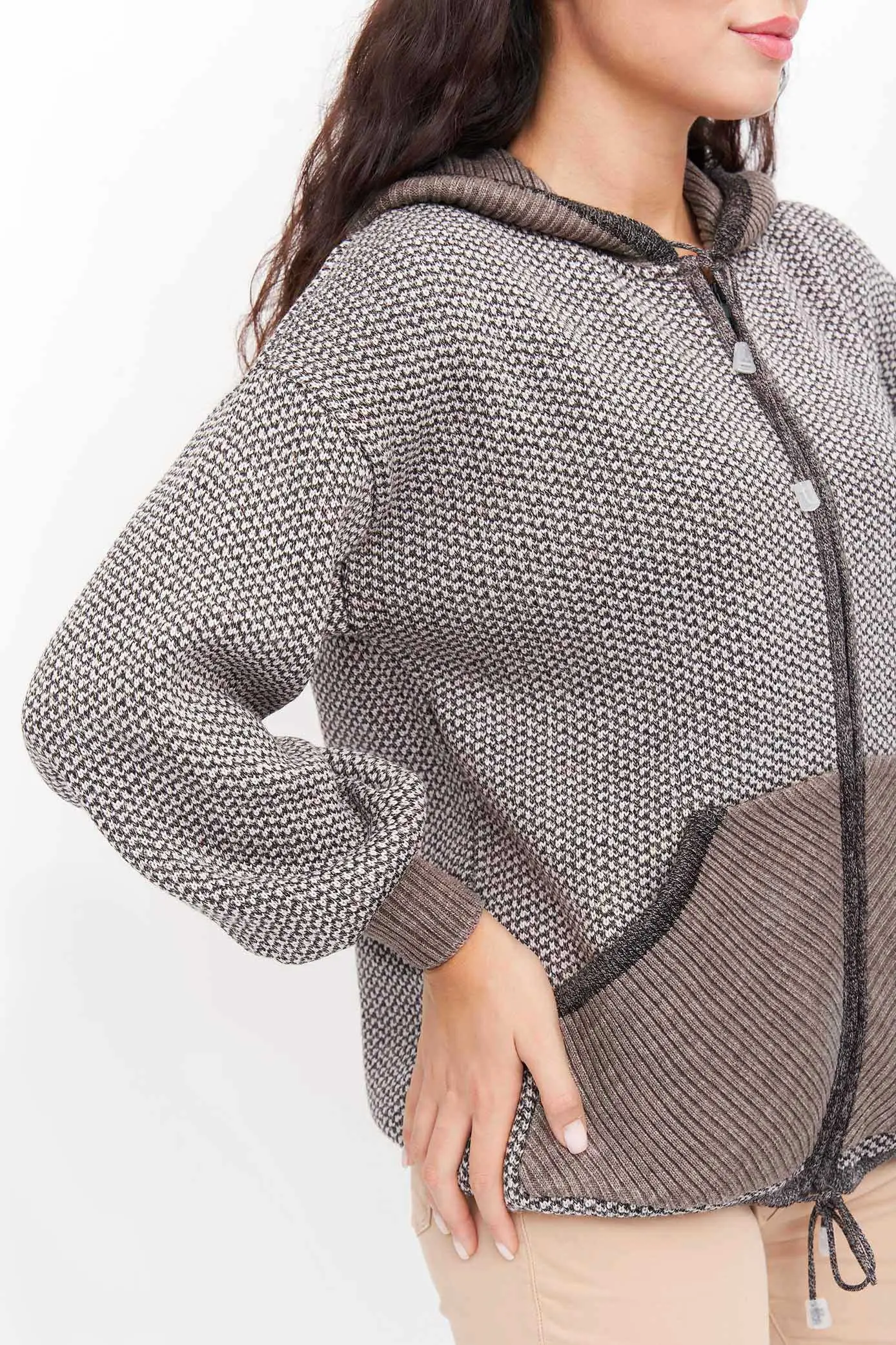- Жакет свободного силуэта на молнии с капюшоном. Два накладных кармана по бокам изделия. Рукава втачные длинные, плечо спущенное. По низу изделия и в капюшон проложен шнурок-утяжка. Жакет выполнен жаккардовым переплетением.