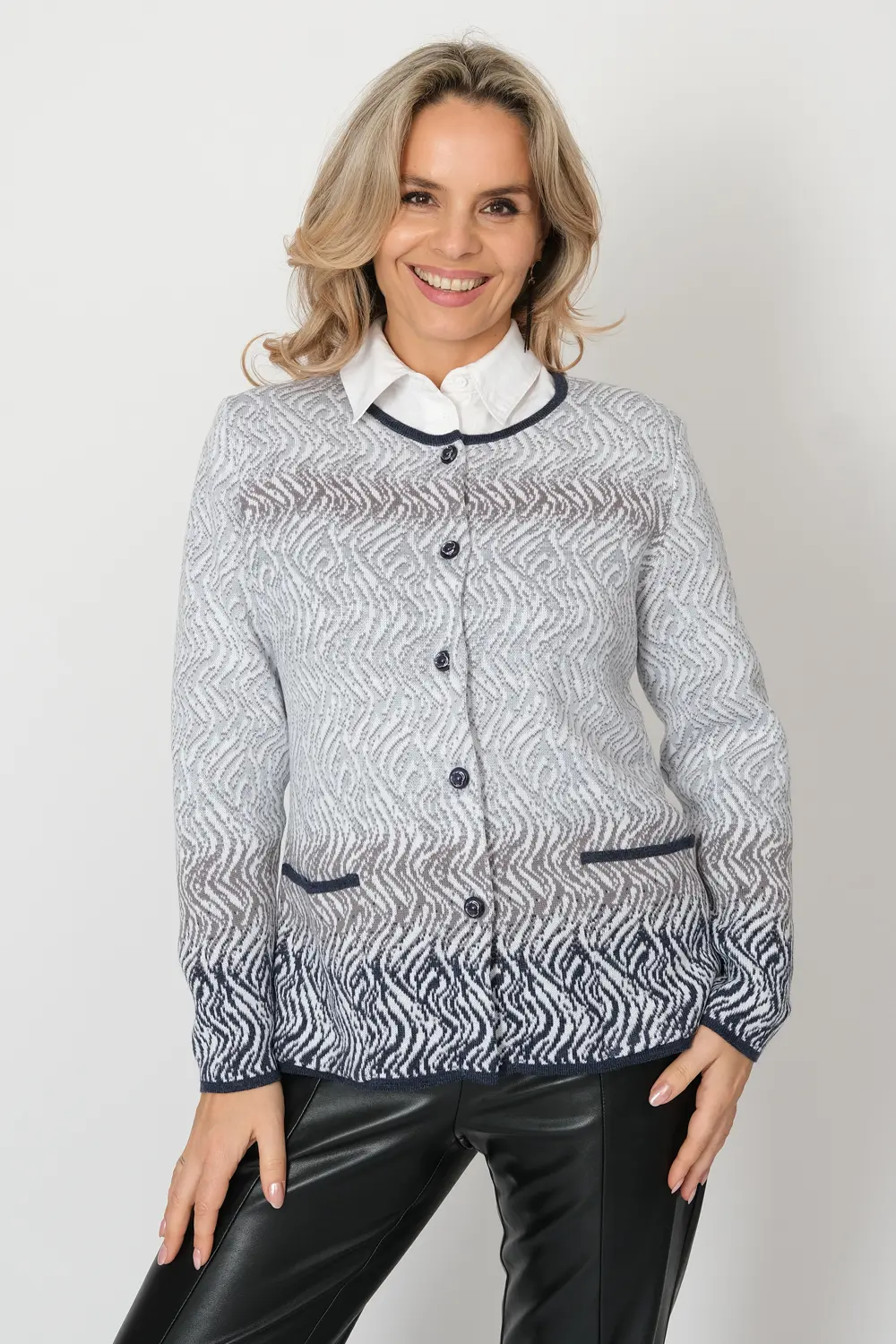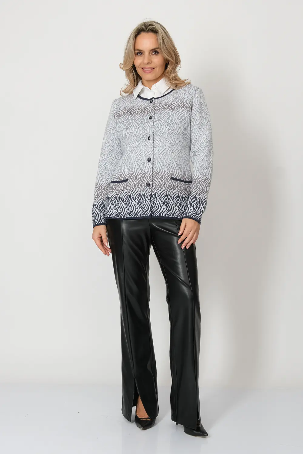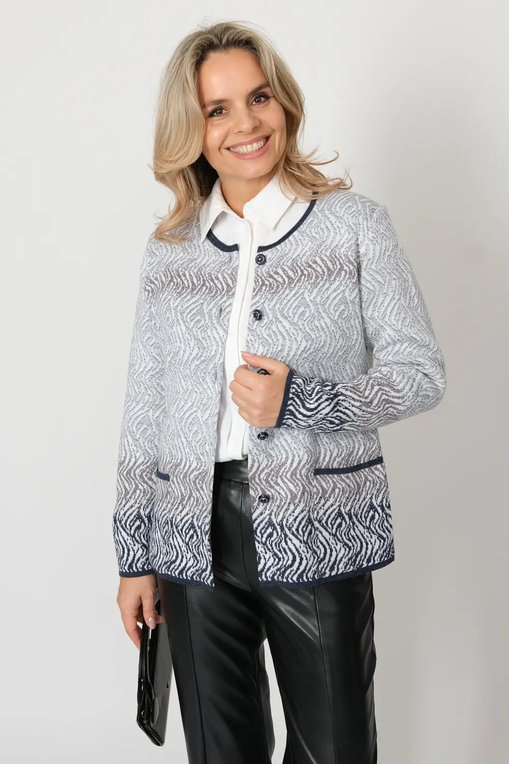 на пуговицы, два накладных кармана. Жакет выполнен жаккардовым переплетением. По низу изделия и рукавов, горловине и входу в карман проходит отделка контрастного цвета. - Новизна: