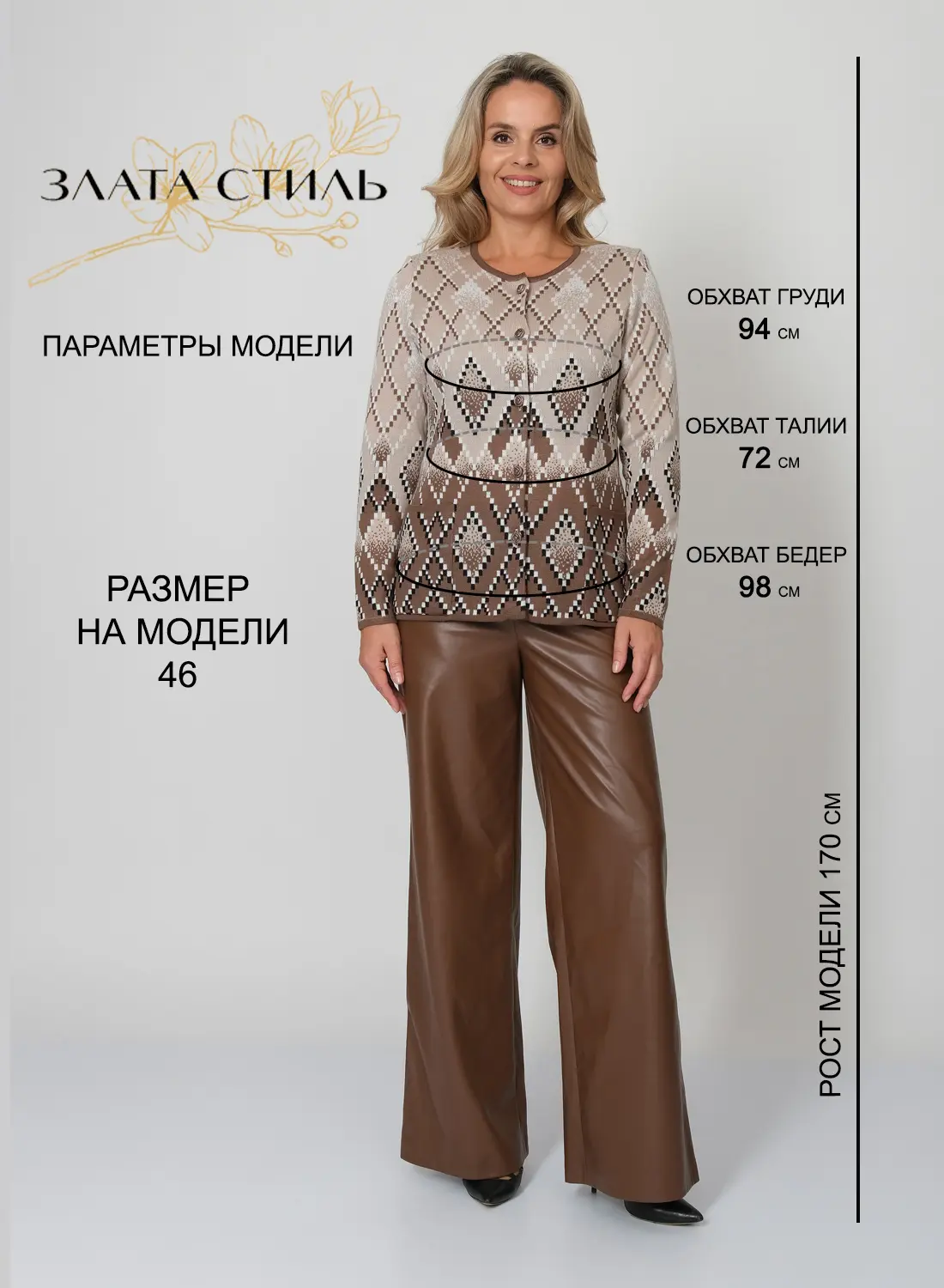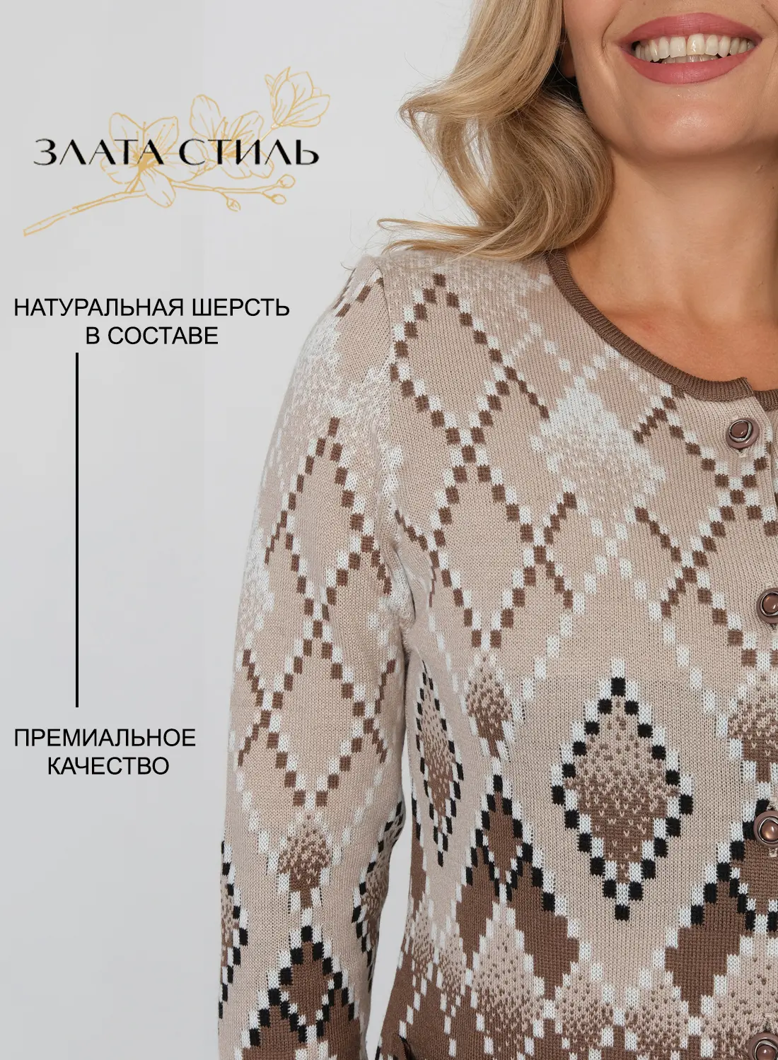 - Женский трикотажный жакет полуприлегающего силуэта. Рукава втачные длинные. Жакет застегивается на пуговицы, горловина круглая. Два накладных кармана квадратной формы. Изделие выполнено жаккардовым переплетние образующим геометрический рисунок с цветовым переходом от светлого к темному.