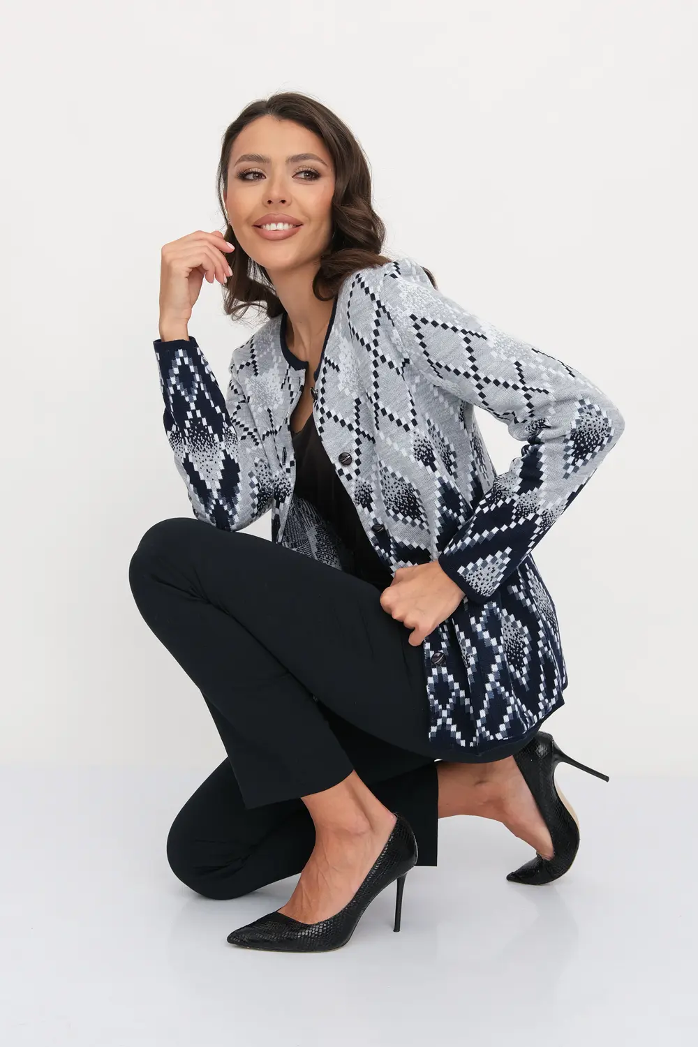 - Женский трикотажный жакет полуприлегающего силуэта. Рукава втачные длинные. Жакет застегивается на пуговицы, горловина круглая. Два накладных кармана квадратной формы. Изделие выполнено жаккардовым переплетние образующим геометрический рисунок с цветовым переходом от светлого к темному.