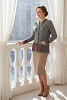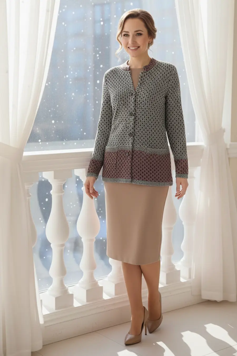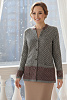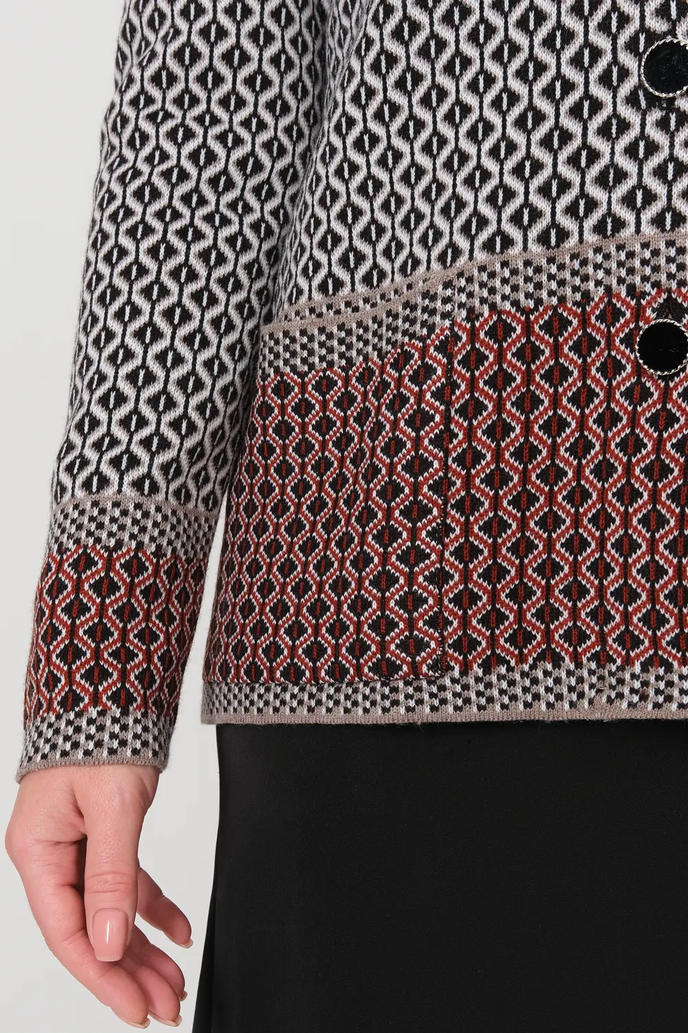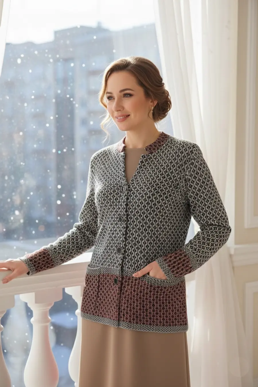 - Женский трикотажный жакет полуприлегающего силуэта. Рукава втачные длинные. Жакет застегивается на пуговицы, горловина круглая, с небольшим воротником-стойкой. Два накладных кармана квадратной формы. Изделие выполнено жаккардовым переплетние образующим геометрический рисунок "мелкие ромбы"