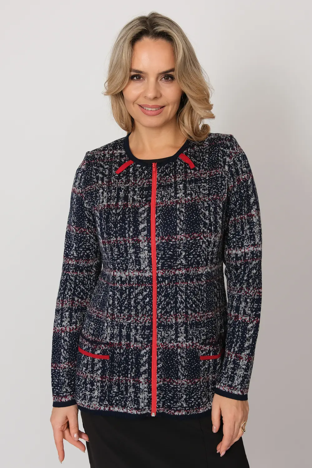 - Женский жакет на молнии полуприлегающего силуэта. Горловина круглая обработана контрастной бейкой. Длинный втачной рукав, накладные карманы. Жакет выполнен жаккардовым переплетением с классическим узором клетка с добавлением акцентных красных деталей. Жакет очень комфортный, прекрасно садится на любой тип фигуры. Отличный как повседневный. так и деловой вариант.