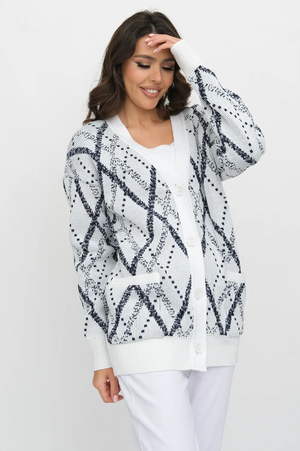 - Жакет свободного силуэта. Рукав длинный реглан с эластичной манжетой. Кардиган застегивается на пуговицы и заканчивается эластичным переплетением. Жакет имеет V-образную горловину. Перед и полочки выполнены одноцветным переплетением чередованием лицевых и изнаночных петель, образующим рисунок "рис". Рукава выполнены гладким одноцветным переплетением. По полочкам и горловине проходит планка .