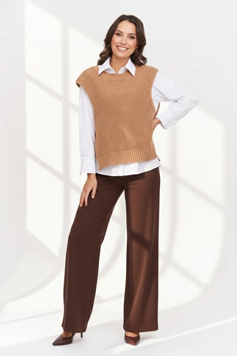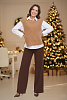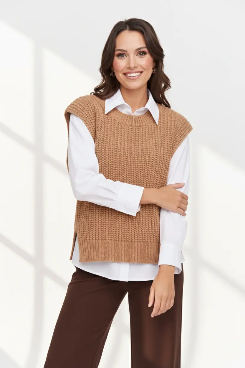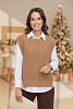 - Оригинальный жилет прямого кроя. Круглая горловина с широкой эластичной резинкой, плечо спущенное. Удлиненная спинка, которая соединяется с передом по бокам трикотажными лентами, Можно надевать в офис и школу поверх блуз, очень практичный в использовании.