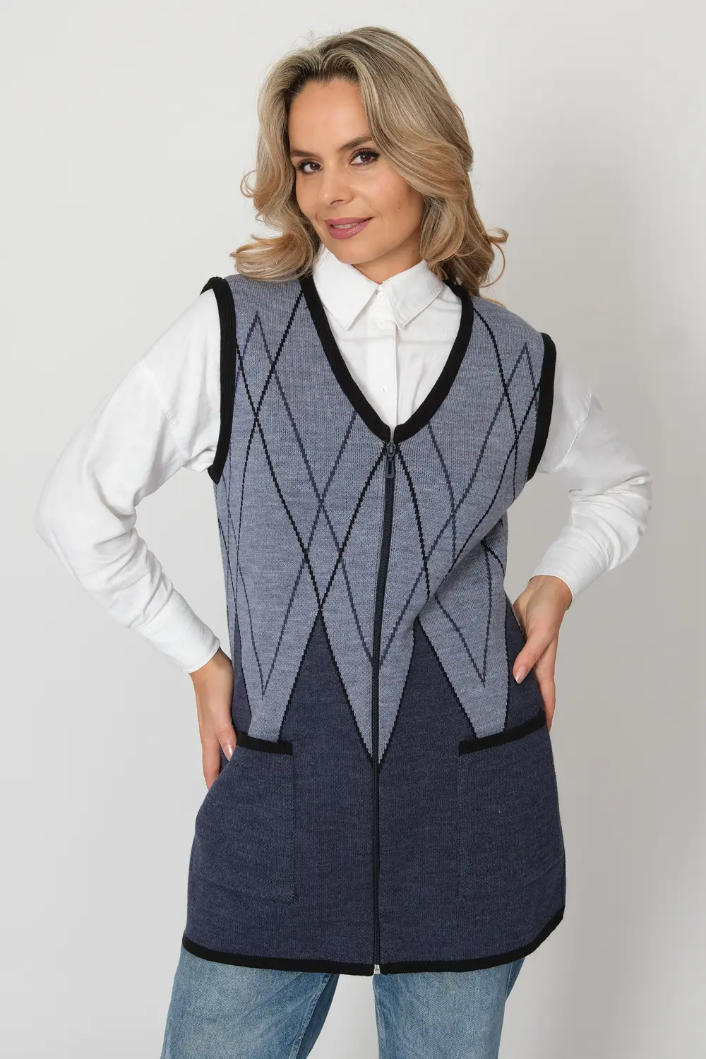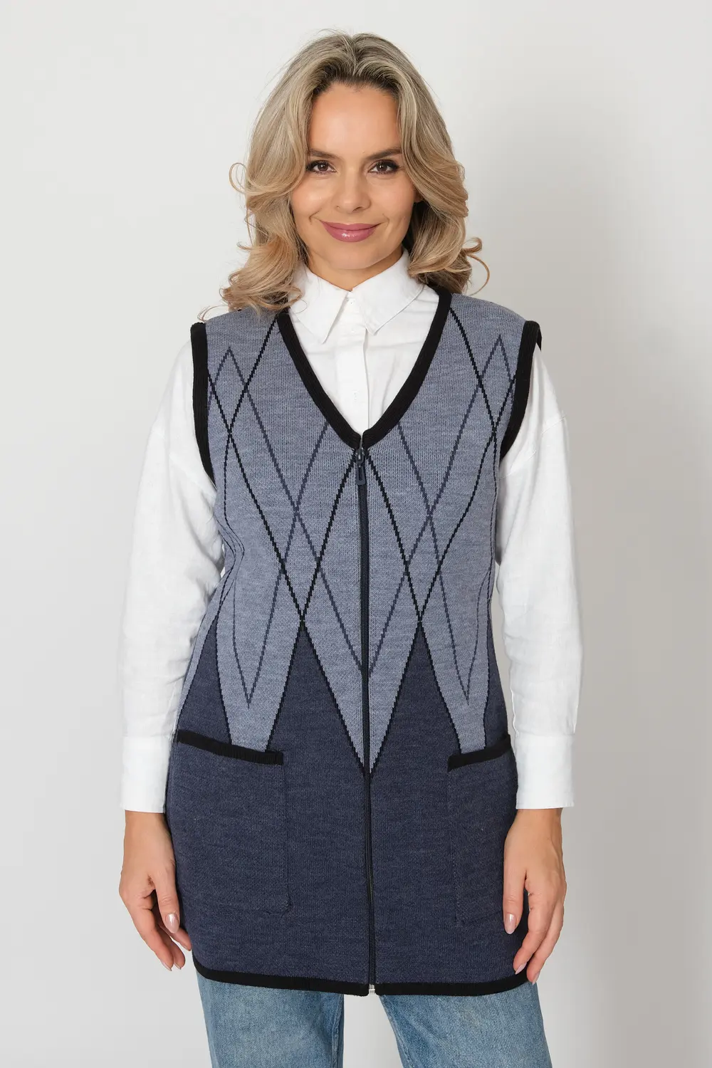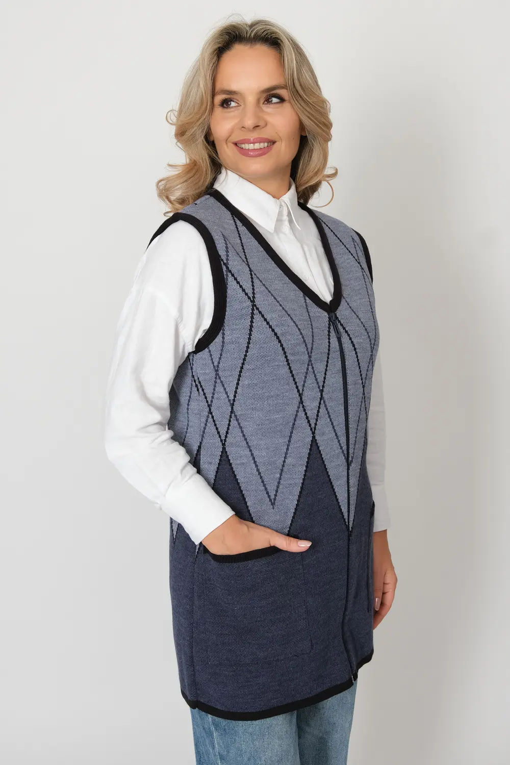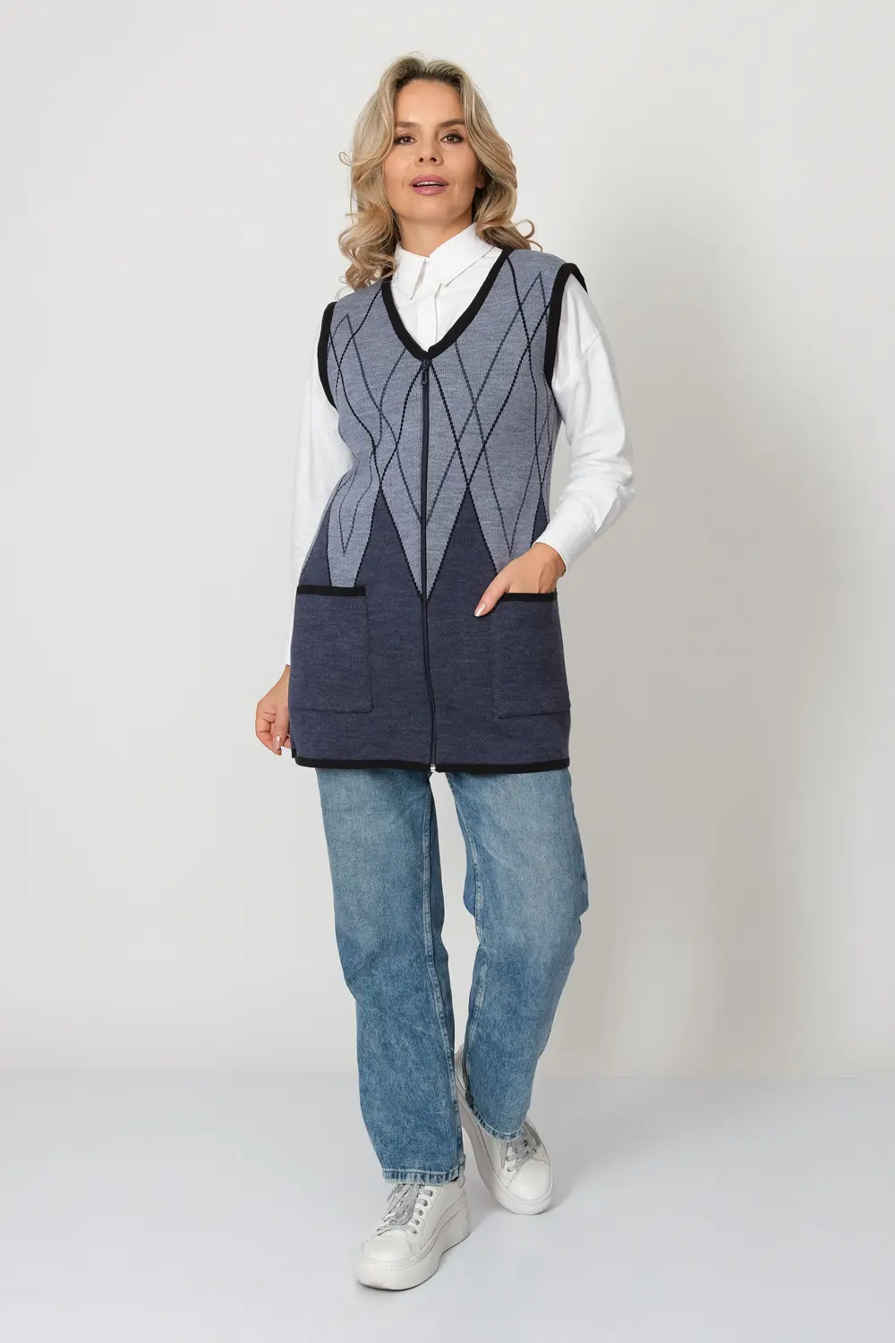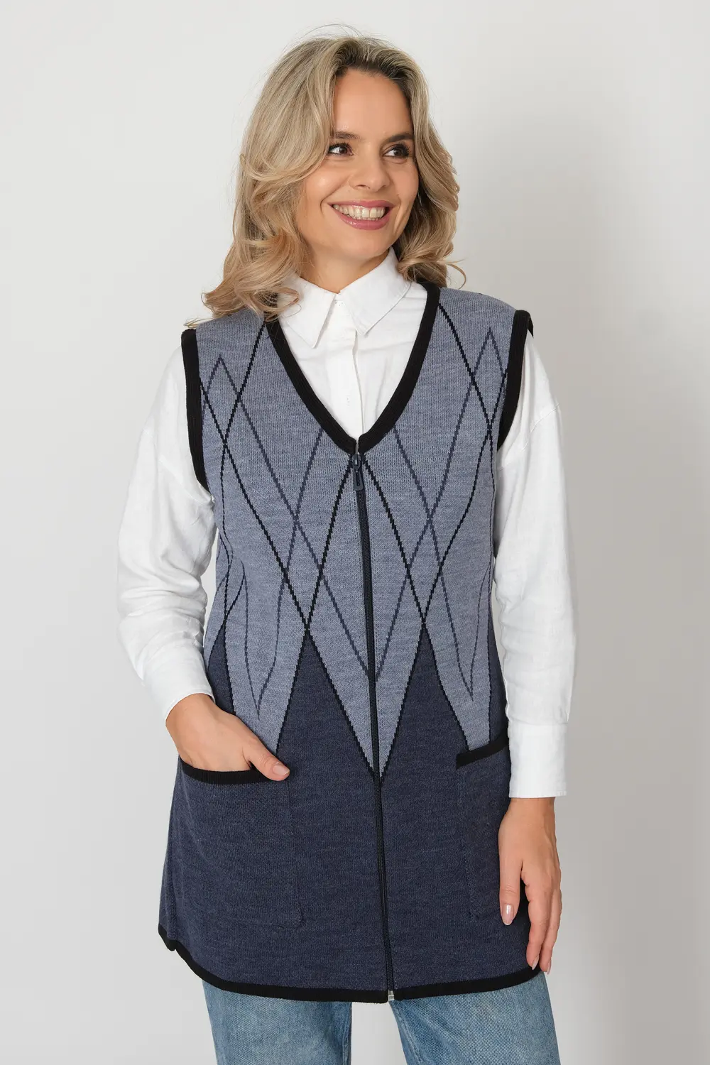 - Женский вязаный жилет на молнии с карманами. Теплая жилетка выполнена из высококачественной пряжи с составом 30% шерсть 70% ПАН. Жилет имеет треугольный вырез горловины и функциональные накладные карманы. Пройма и борта окантованы трикотажной бейкой. Жилет выполнен жаккардовым переплетением, образующим красивый, геометрический рисунок. Модель полуприлегающего силуэта подойдет для любого типа фигуры и составит модный и интересный образ с любым низом: брюки, джинсы, юбка.