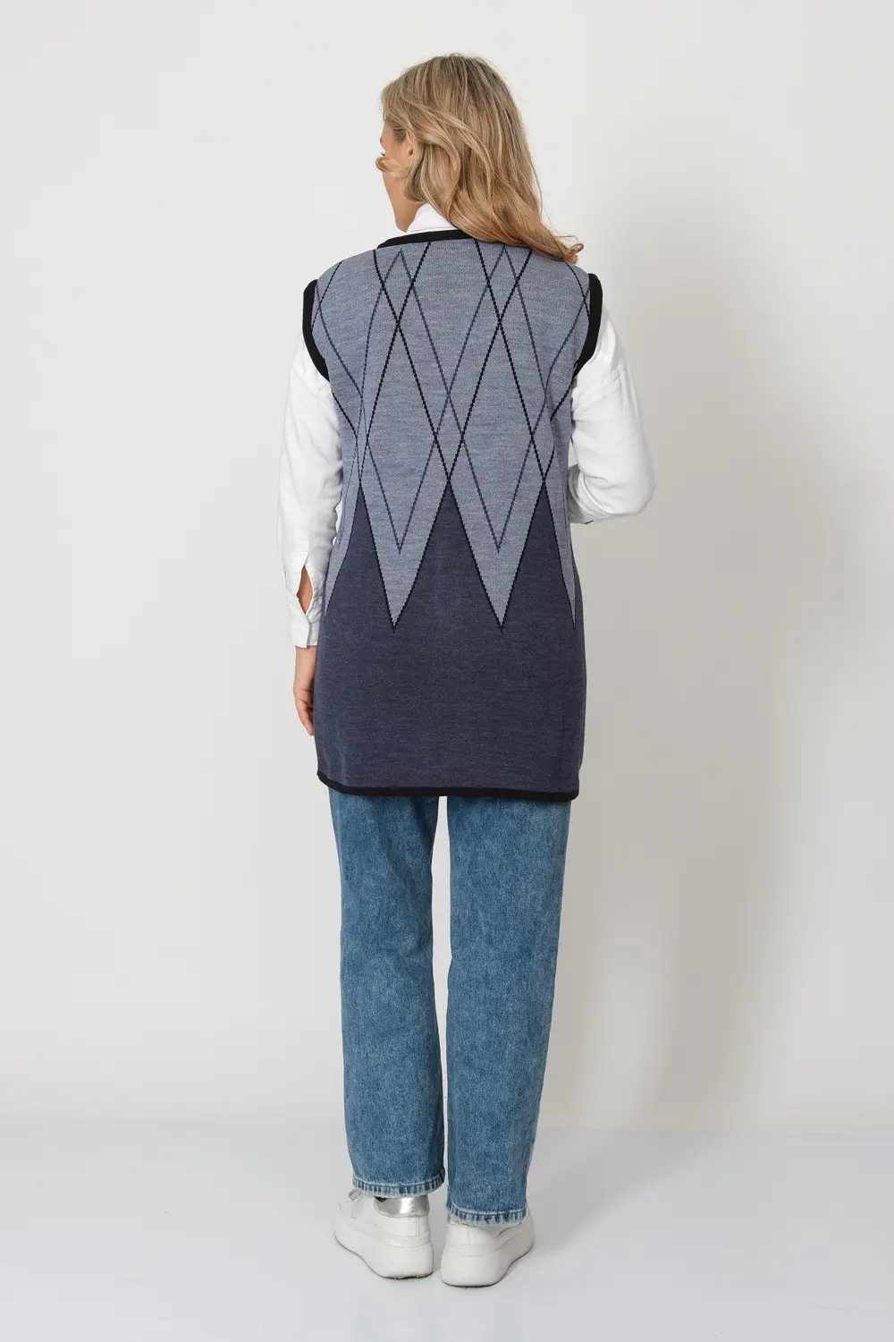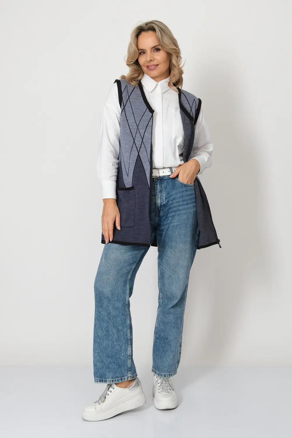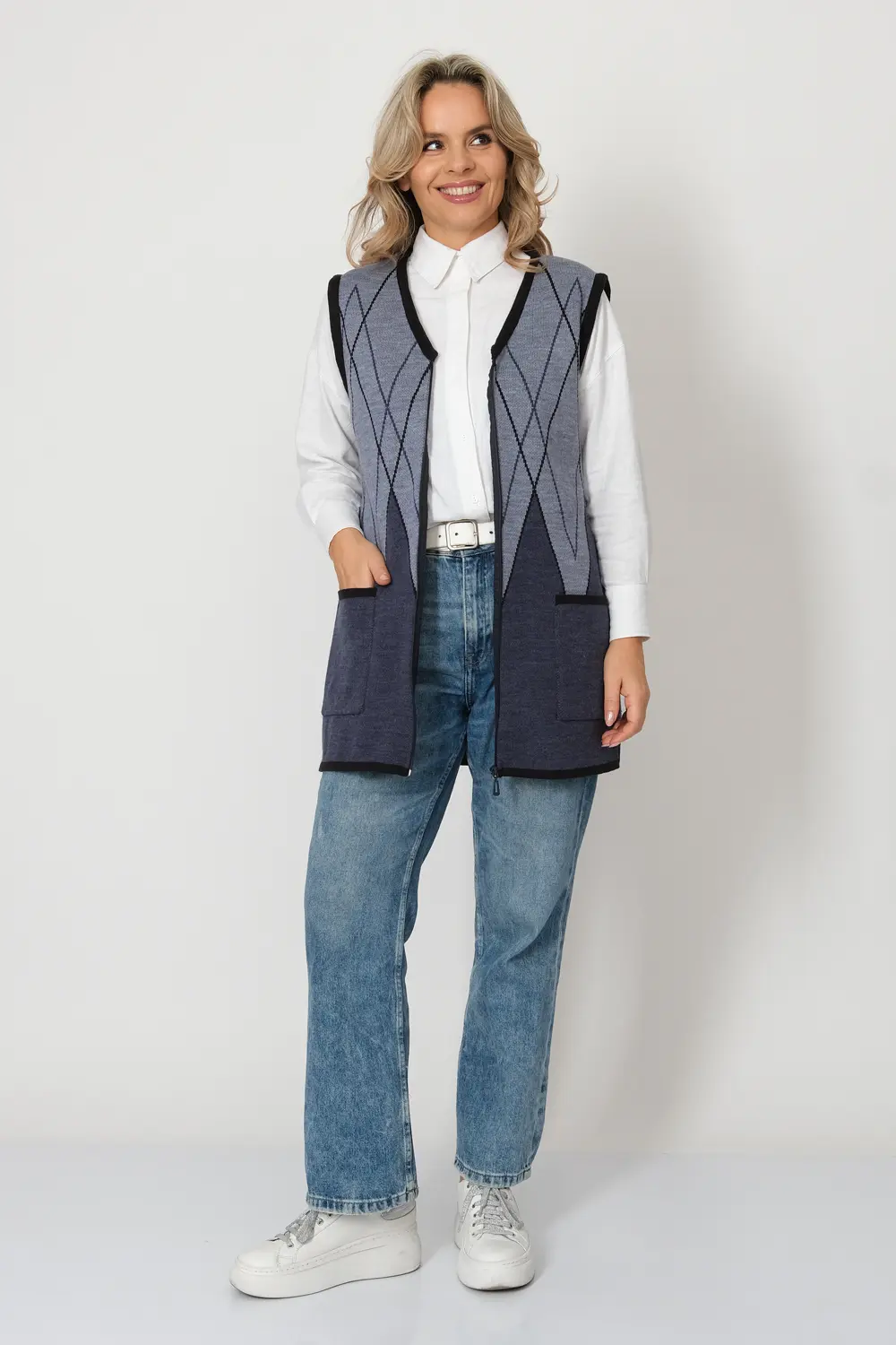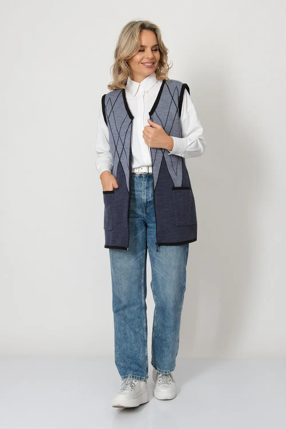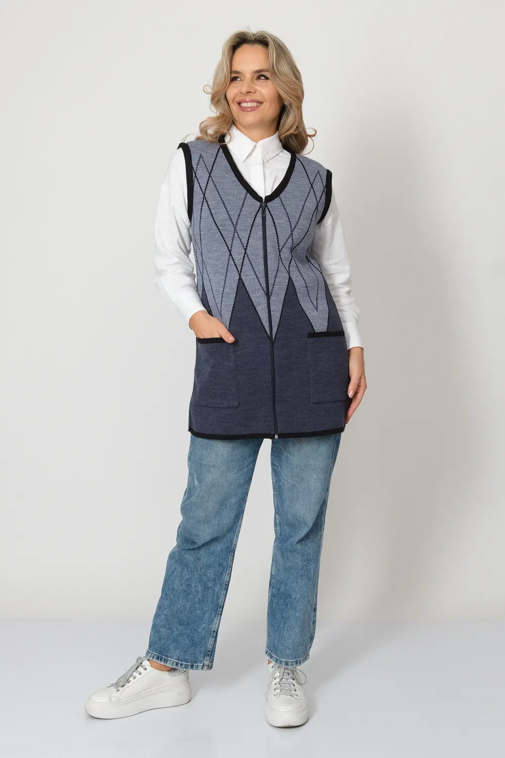 - Женский вязаный жилет на молнии с карманами. Теплая жилетка выполнена из высококачественной пряжи с составом 30% шерсть 70% ПАН. Жилет имеет треугольный вырез горловины и функциональные накладные карманы. Пройма и борта окантованы трикотажной бейкой. Жилет выполнен жаккардовым переплетением, образующим красивый, геометрический рисунок. Модель полуприлегающего силуэта подойдет для любого типа фигуры и составит модный и интересный образ с любым низом: брюки, джинсы, юбка.
