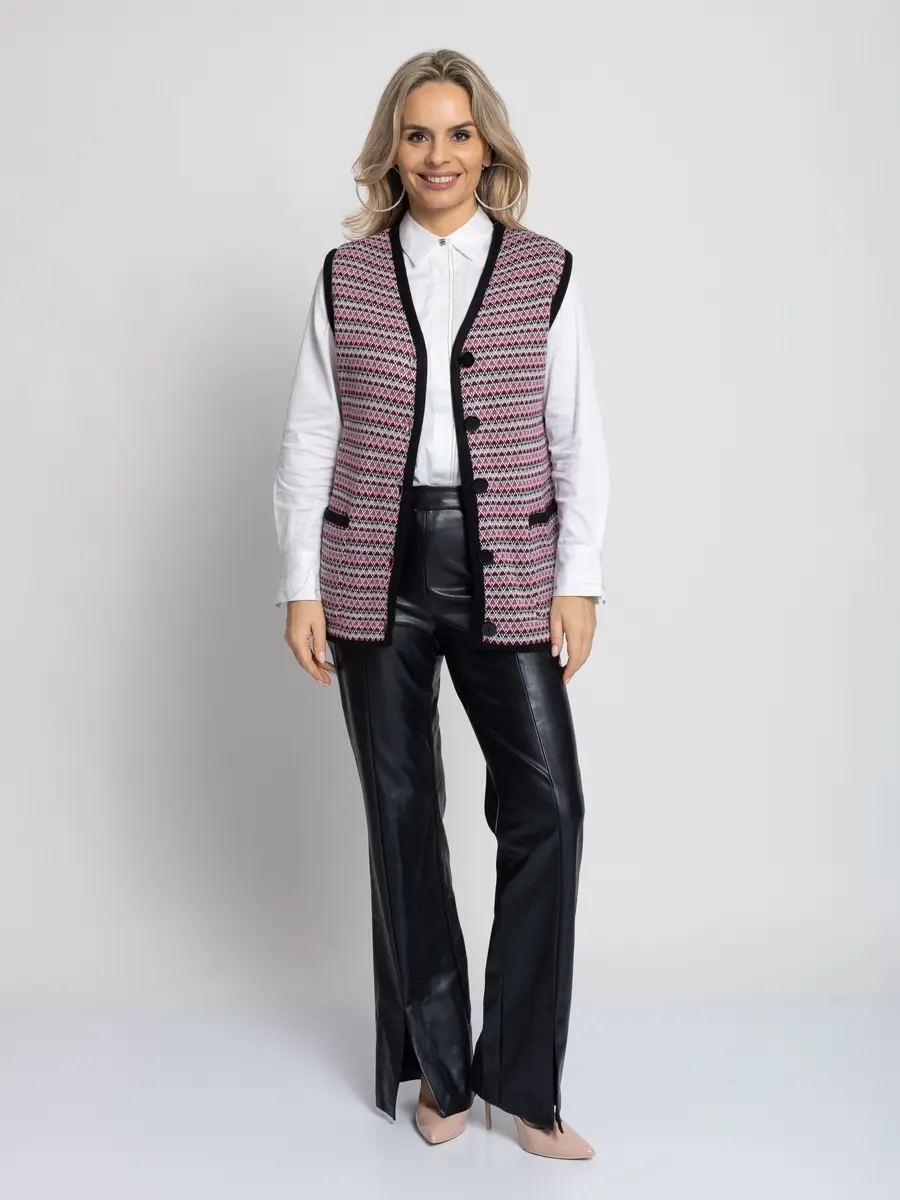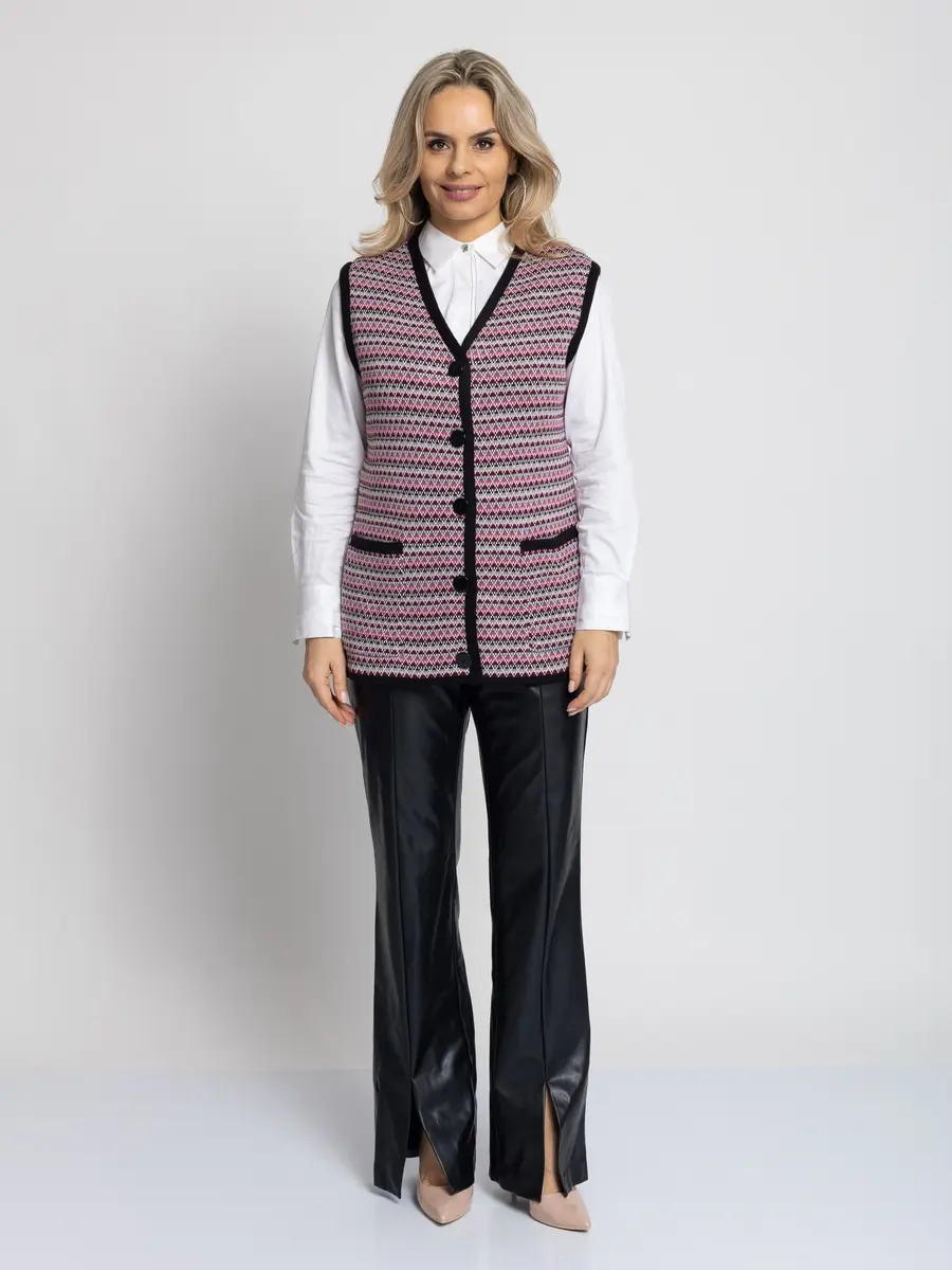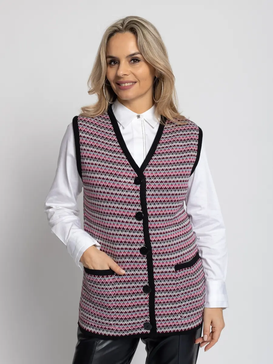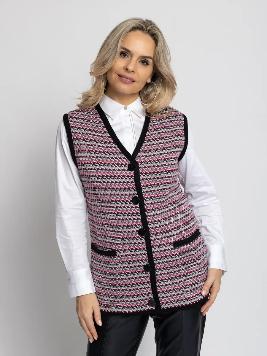 - Женский вязаный жилет на пуговицах с карманами. Теплая жилетка выполнена из высококачественной пряжи с составом 30% шерсть 70% ПАН. Жилет имеет треугольный вырез горловины и функциональные накладные карманы. Жилет выполнен жаккардовым переплетением, образующим красивый, оригинальный орнамент. Модель прямого силуэта подойдет для любого типа фигуры и составит модный и интересный образ с любым низом: брюки, джинсы, юбка.