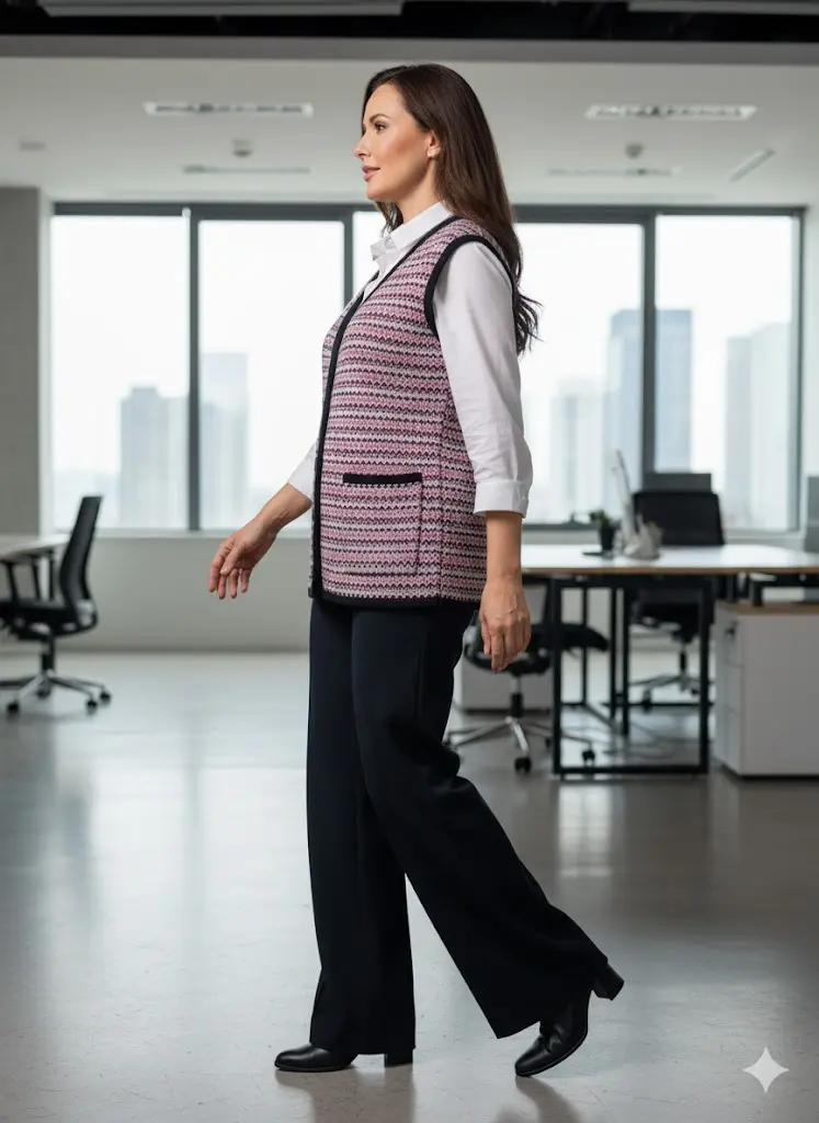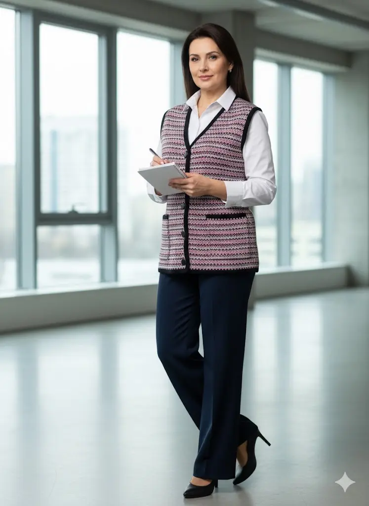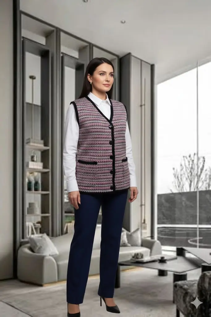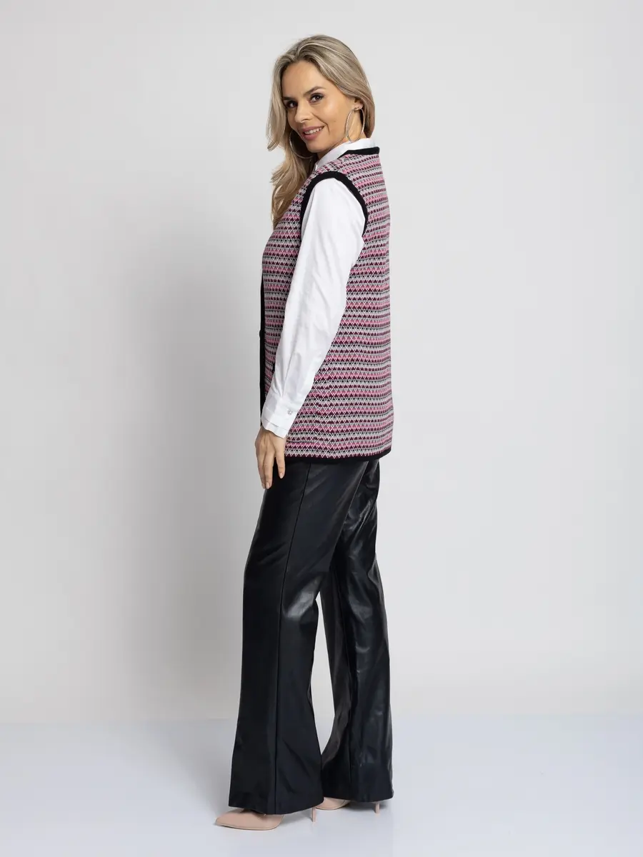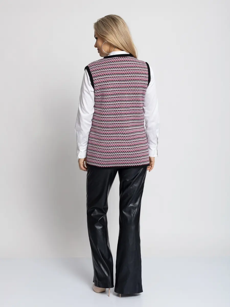 - Женский вязаный жилет на пуговицах с карманами. Теплая жилетка выполнена из высококачественной пряжи с составом 30% шерсть 70% ПАН. Жилет имеет треугольный вырез горловины и функциональные накладные карманы. Жилет выполнен жаккардовым переплетением, образующим красивый, оригинальный орнамент. Модель прямого силуэта подойдет для любого типа фигуры и составит модный и интересный образ с любым низом: брюки, джинсы, юбка.