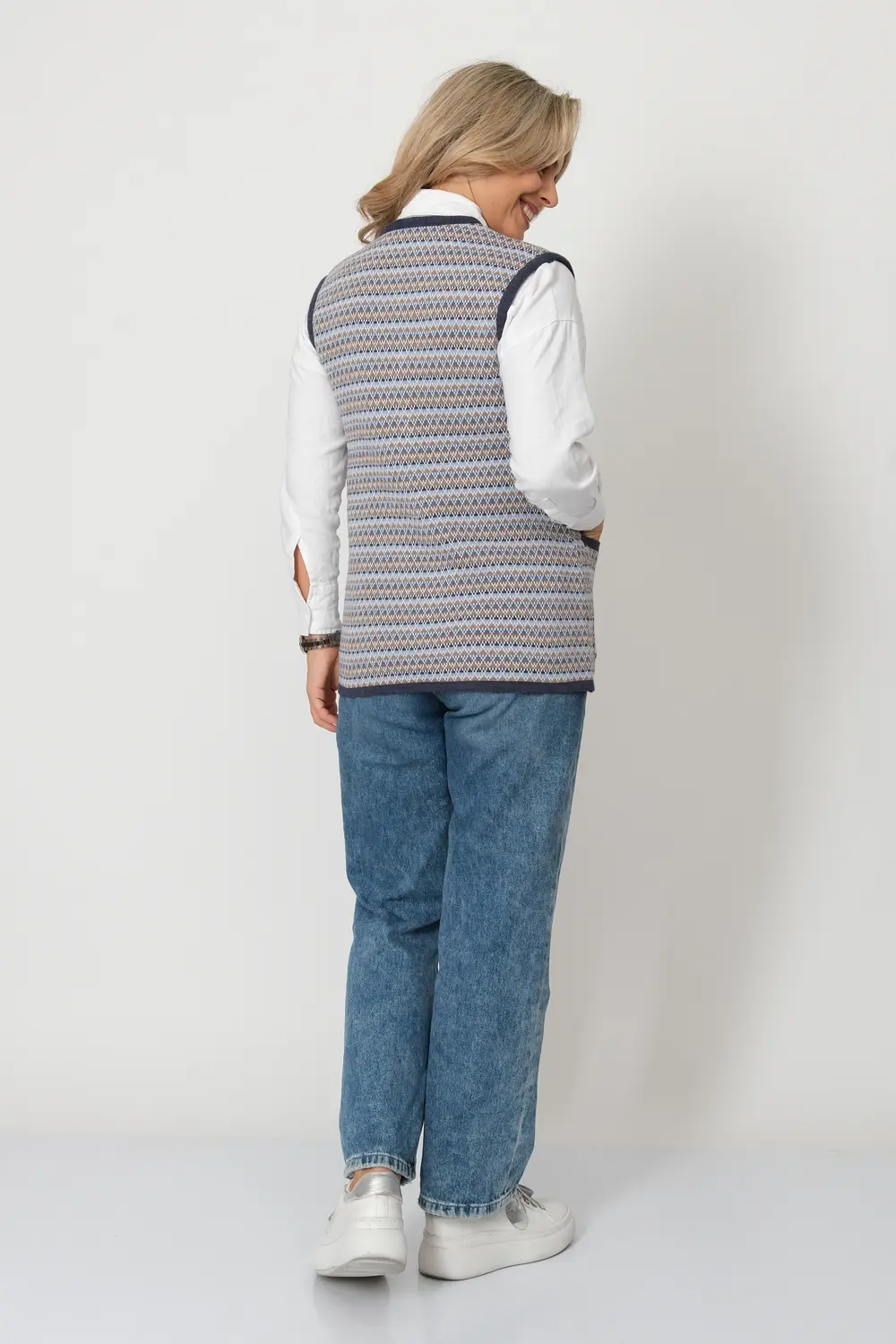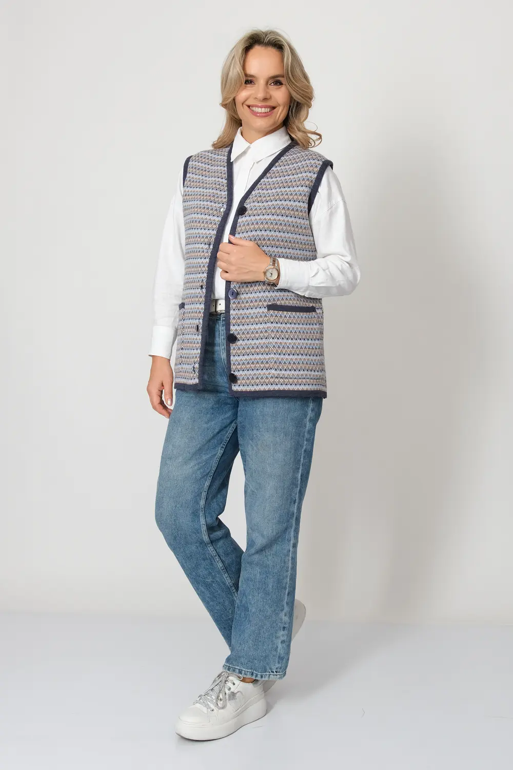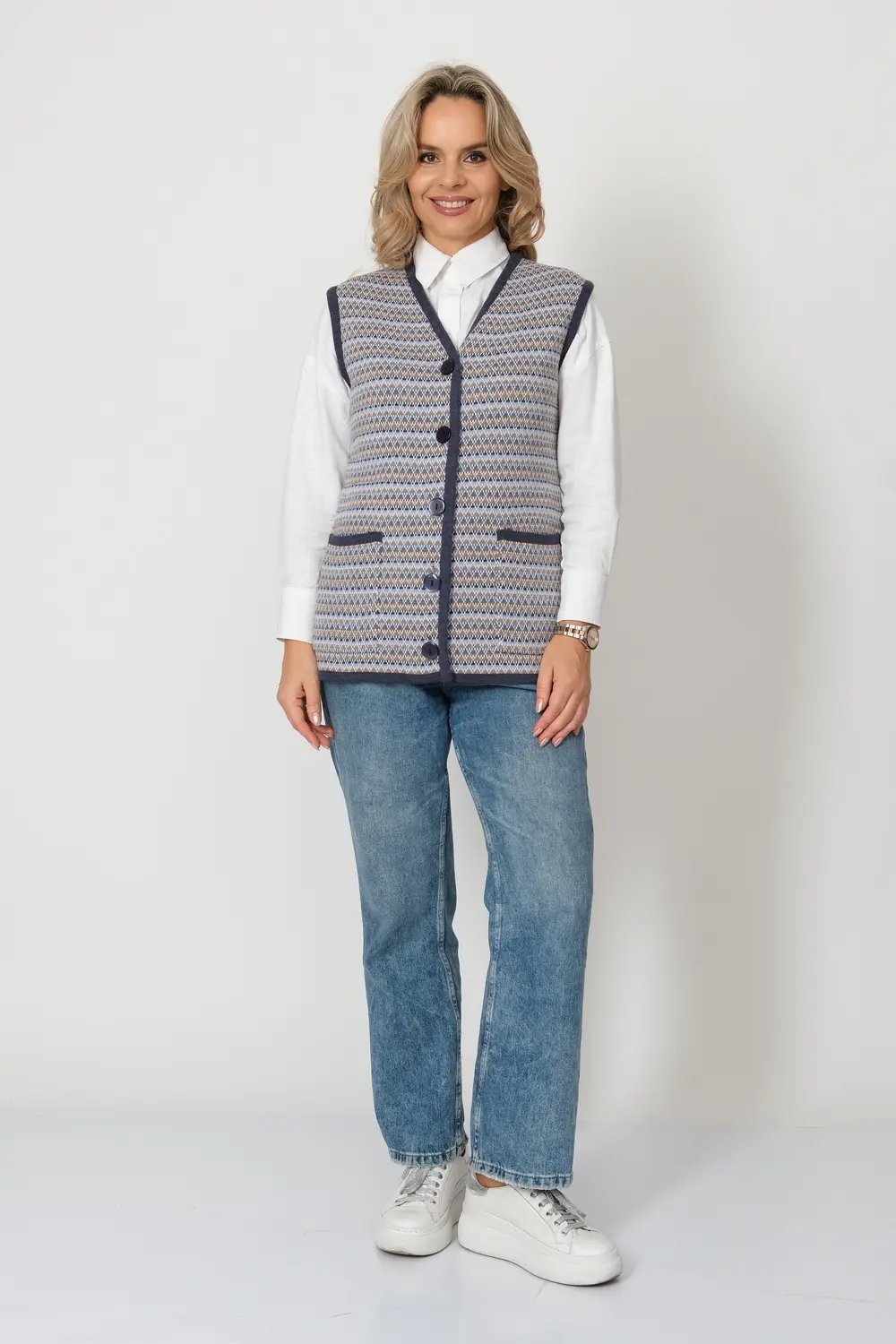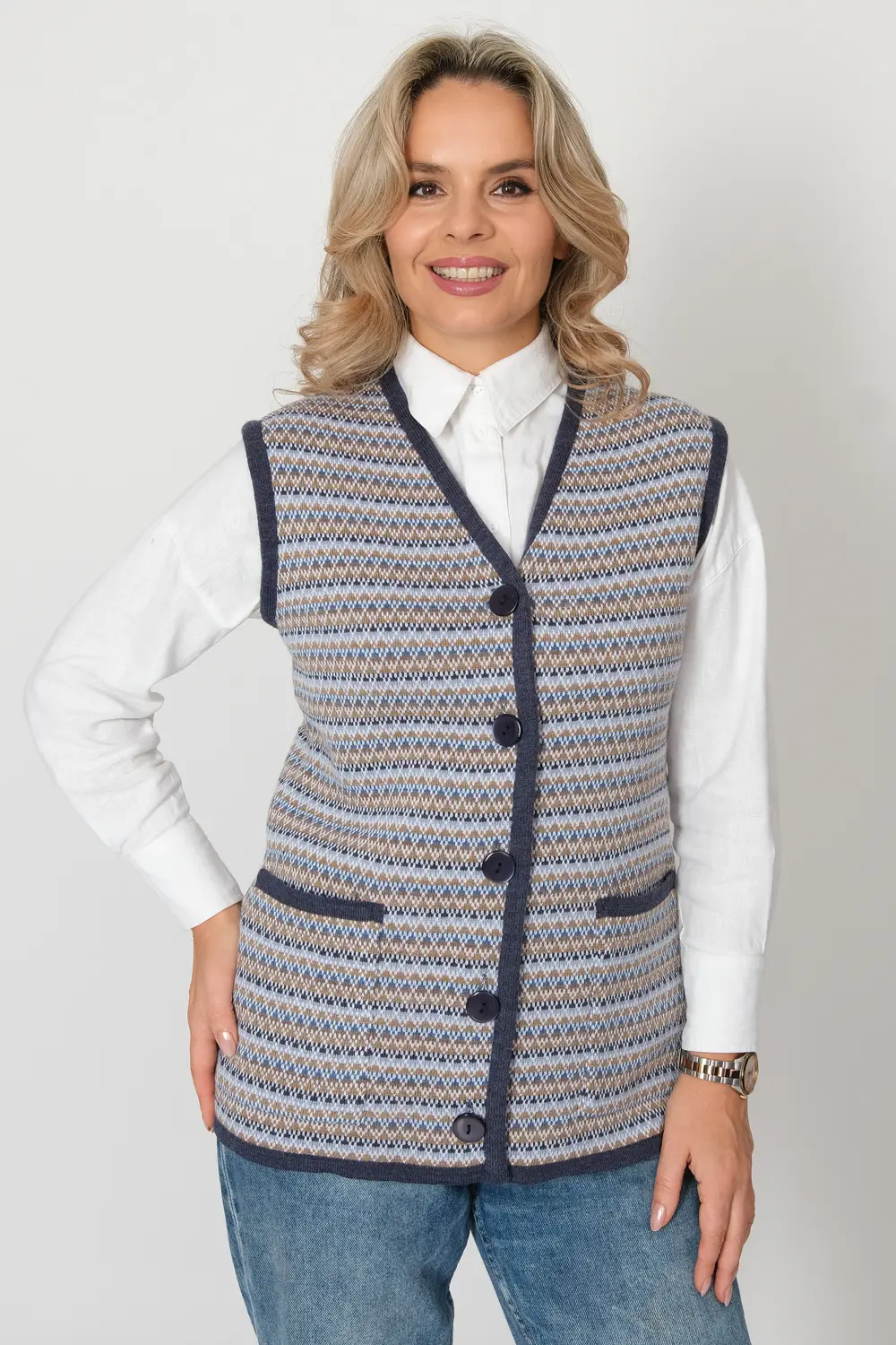 - Женский вязаный жилет на пуговицах с карманами. Теплая жилетка выполнена из высококачественной пряжи с составом 30% шерсть 70% ПАН. Жилет имеет треугольный вырез горловины и функциональные накладные карманы. Жилет выполнен жаккардовым переплетением, образующим красивый, оригинальный орнамент. Модель прямого силуэта подойдет для любого типа фигуры и составит модный и интересный образ с любым низом: брюки, джинсы, юбка.